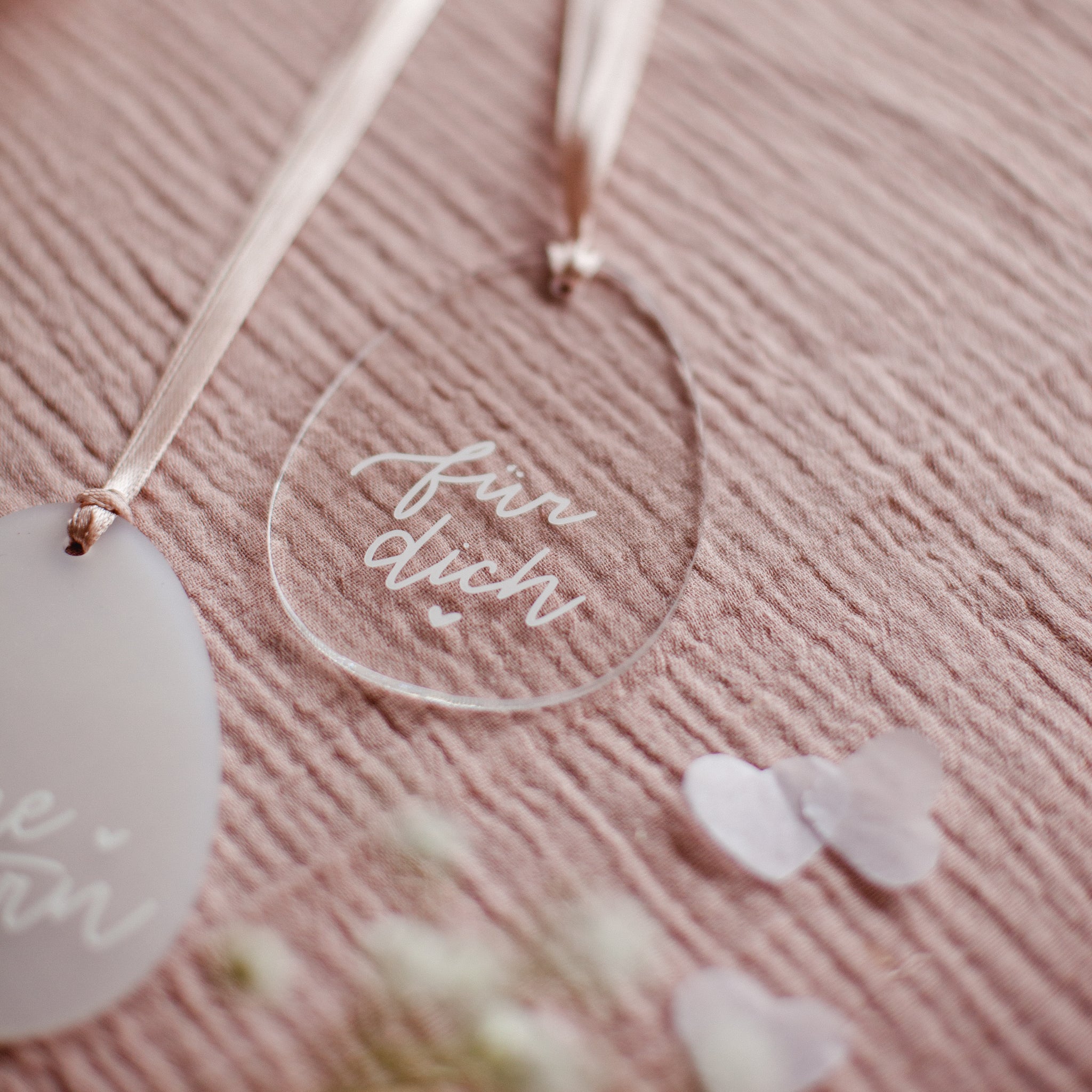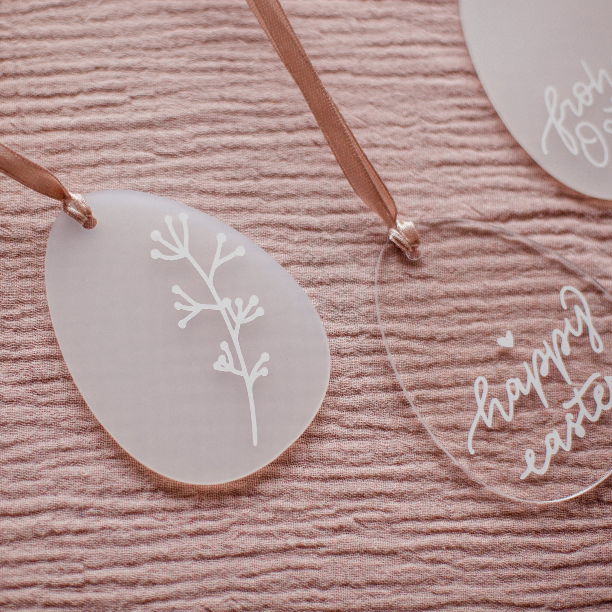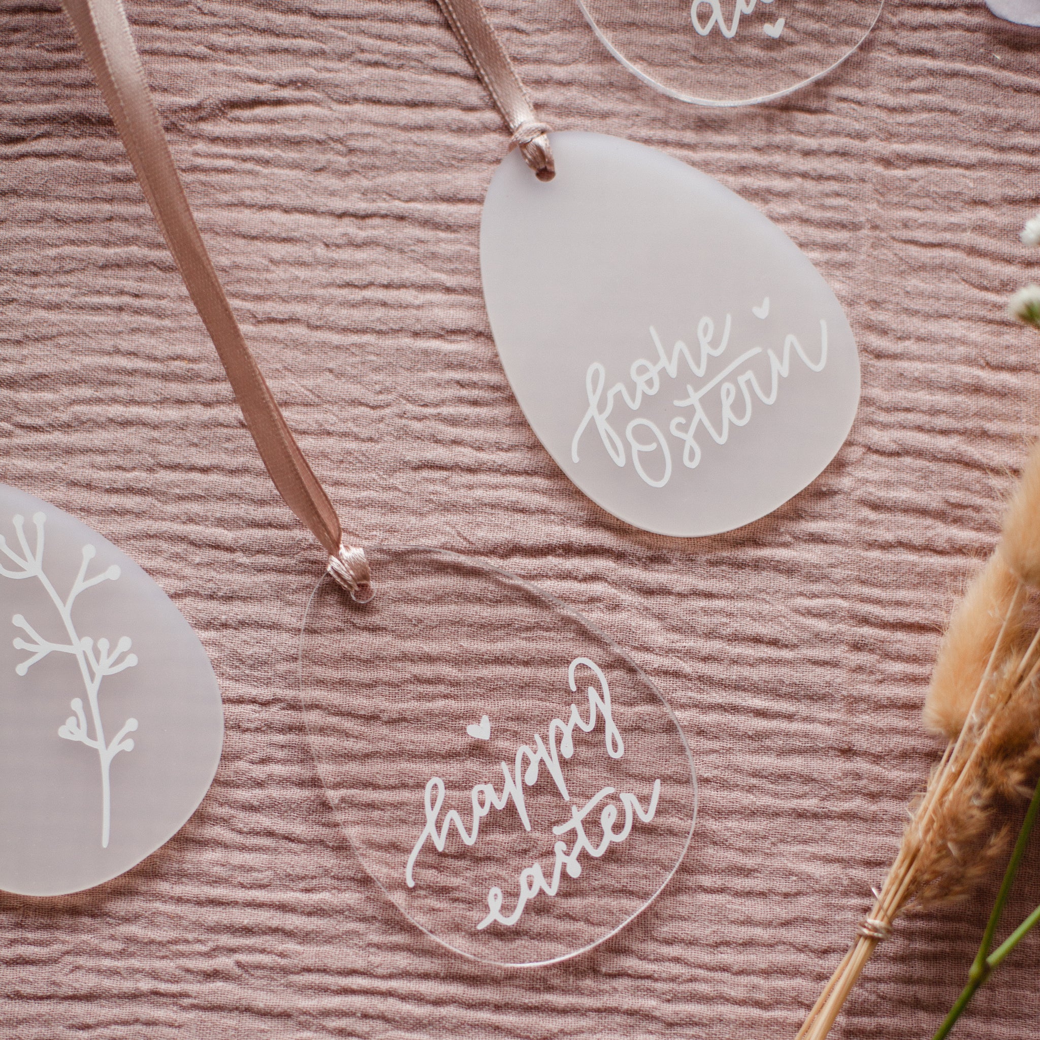 Gib in Bemerkungen gerne an, welchen Anhänger, mit welchem Motiv du in einem anderen Material haben möchtest. Wie zum Beispiel "happy easter" in Milchoptik und alle anderen auf Transparent.