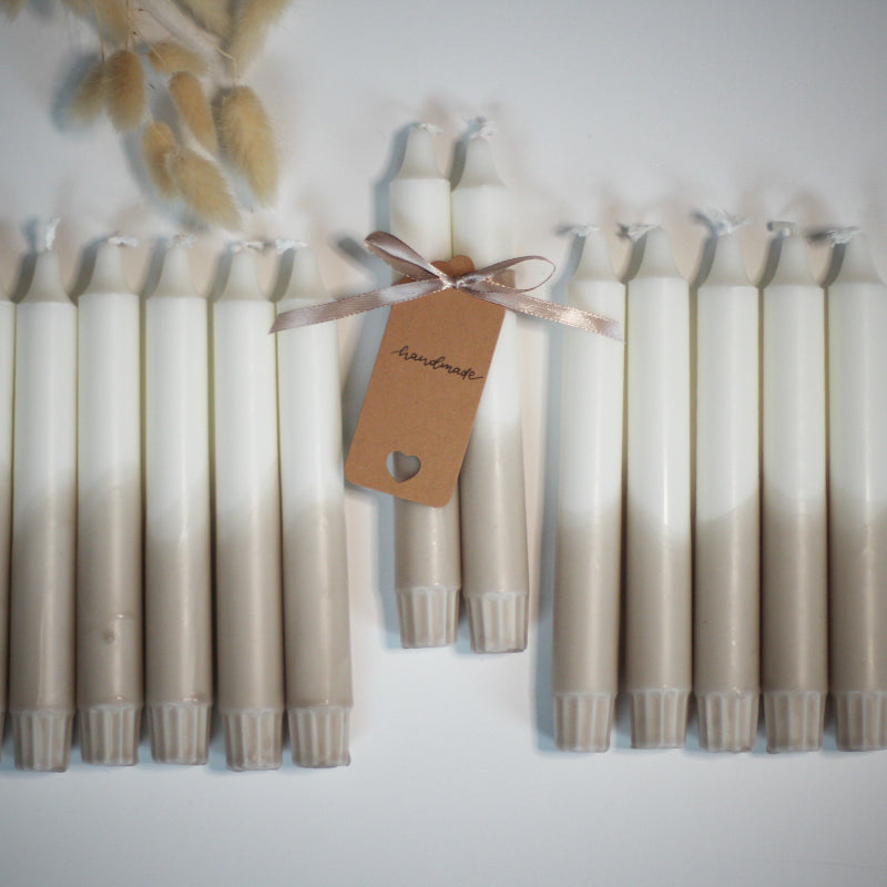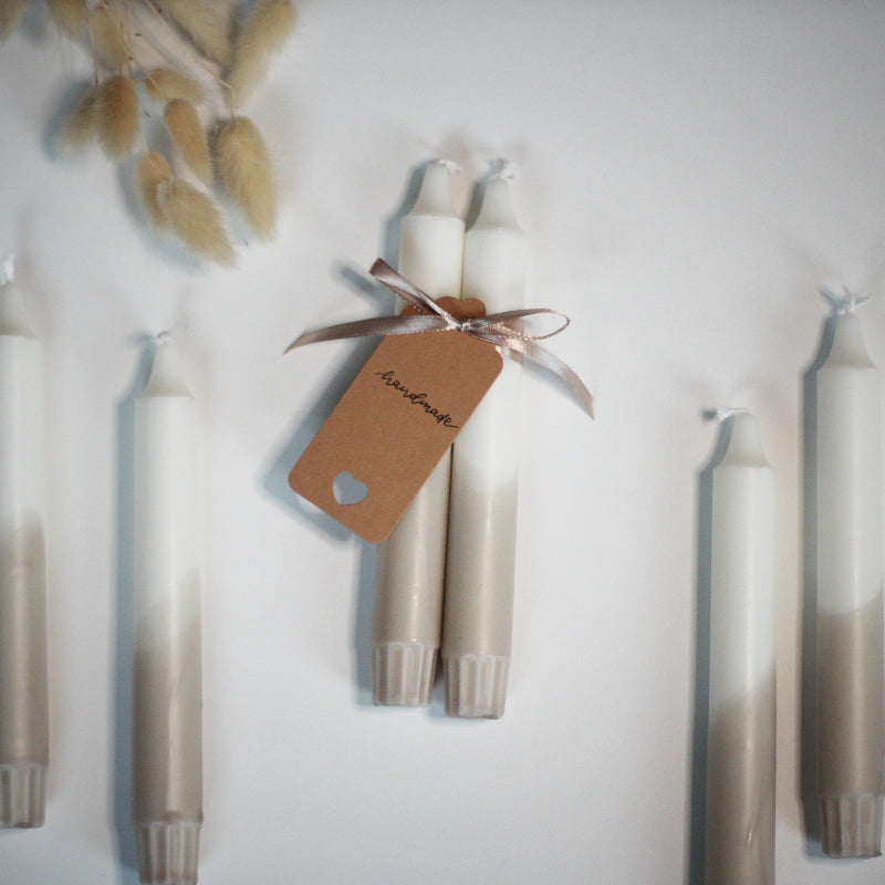 Diese Stabkerzen eignen sich hervorragend zum Verschenken oder dekorieren, denn durch die besondere und schlichte Optik passen sie in jedes Zuhause. Größe: 19 cmFarbe: weiß, beige/grauMaterial: KerzenwachsBrenndauer: ca. 6 Std.